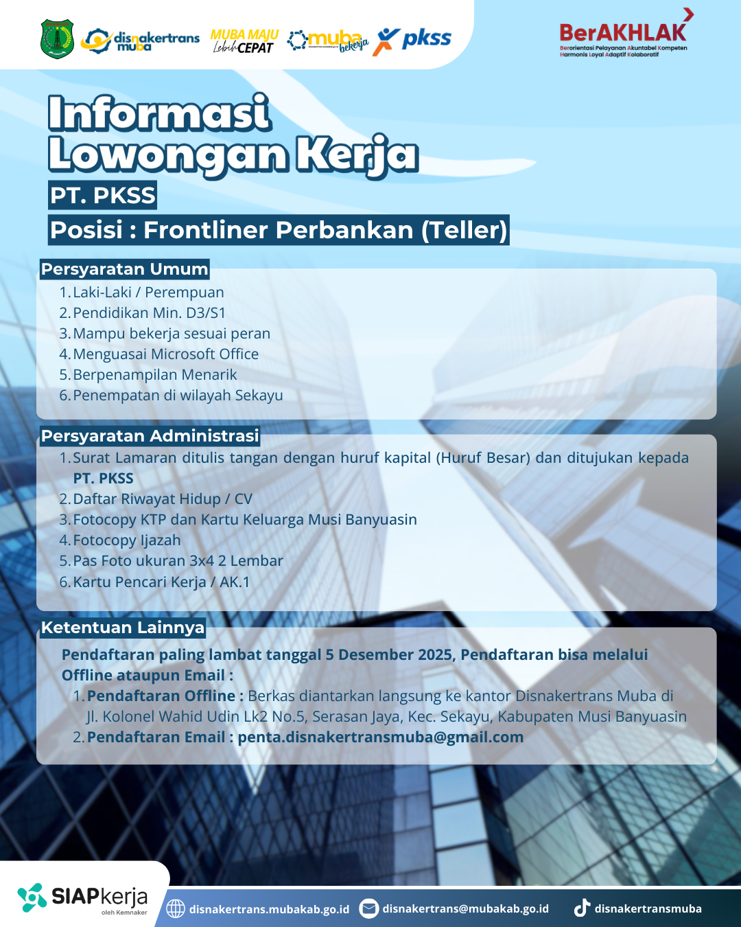 SEKAYU – Kabar gembira bagi para pencari kerja di Kabupaten Musi Banyuasin (Muba). Dinas Tenaga Kerja dan Transmigrasi (Disnakertrans) Muba bekerja sama dengan PT. PKSS (Permata Karya Sinergi) kembali membuka rekrutmen tenaga kerja profesional untuk posisi Frontliner Perbankan (Teller) dengan penempatan di wilayah Sekayu.